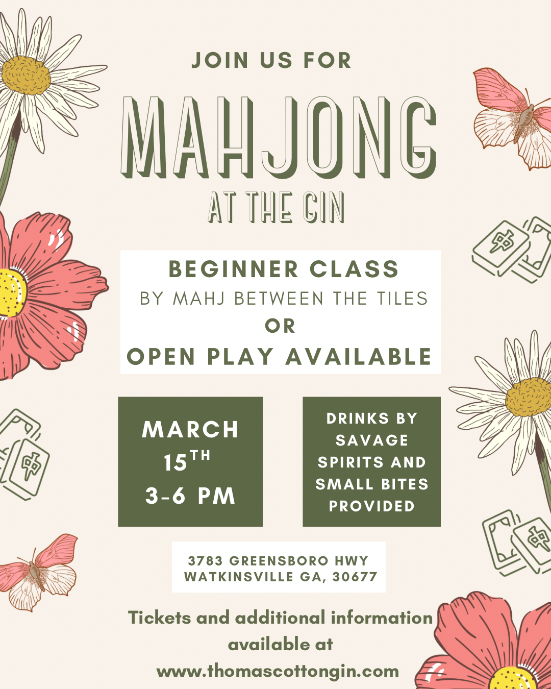 Email madison@thomascottongin.com with any questions!! Mahjong at the Gin Tickets Mahjong at the Gin Tickets Clear Filters Filter Clear Filter Open Play (no cocktails) Includes 2.5 hours of open play and small bites! Please bring your own 2025 National Mahjong League Card! $30.00 Add To Cart Added! Open Play + 2 Cocktails Includes 2.5 hours of open play, 2 cocktails by Savage Spirits and small bites! Please bring your own 2025 National Mahjong League Card! $45.00 Add To Cart Added! Beginner Class (no cocktails) Includes 2.5 hours of instruction by Mahj Between the Tiles and small bites! $75.00 Sold out Sold Out Added! Beginner Class + 2 cocktails Includes 2.5 hours of instruction by Mahj Between the Tiles, 2 cocktails from Savage Spirits and small bites! $90.00 Sold out Sold Out Added! No results found No results match your search. Try removing a few filters.